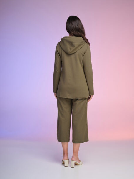 Camisola com fundo arredondado, mais comprida na costa. Manga comprida com racha na bainha. Decote em bico com trincha trespassada. Capuz com cordão e ponteiras. Bolso metido com vivo.