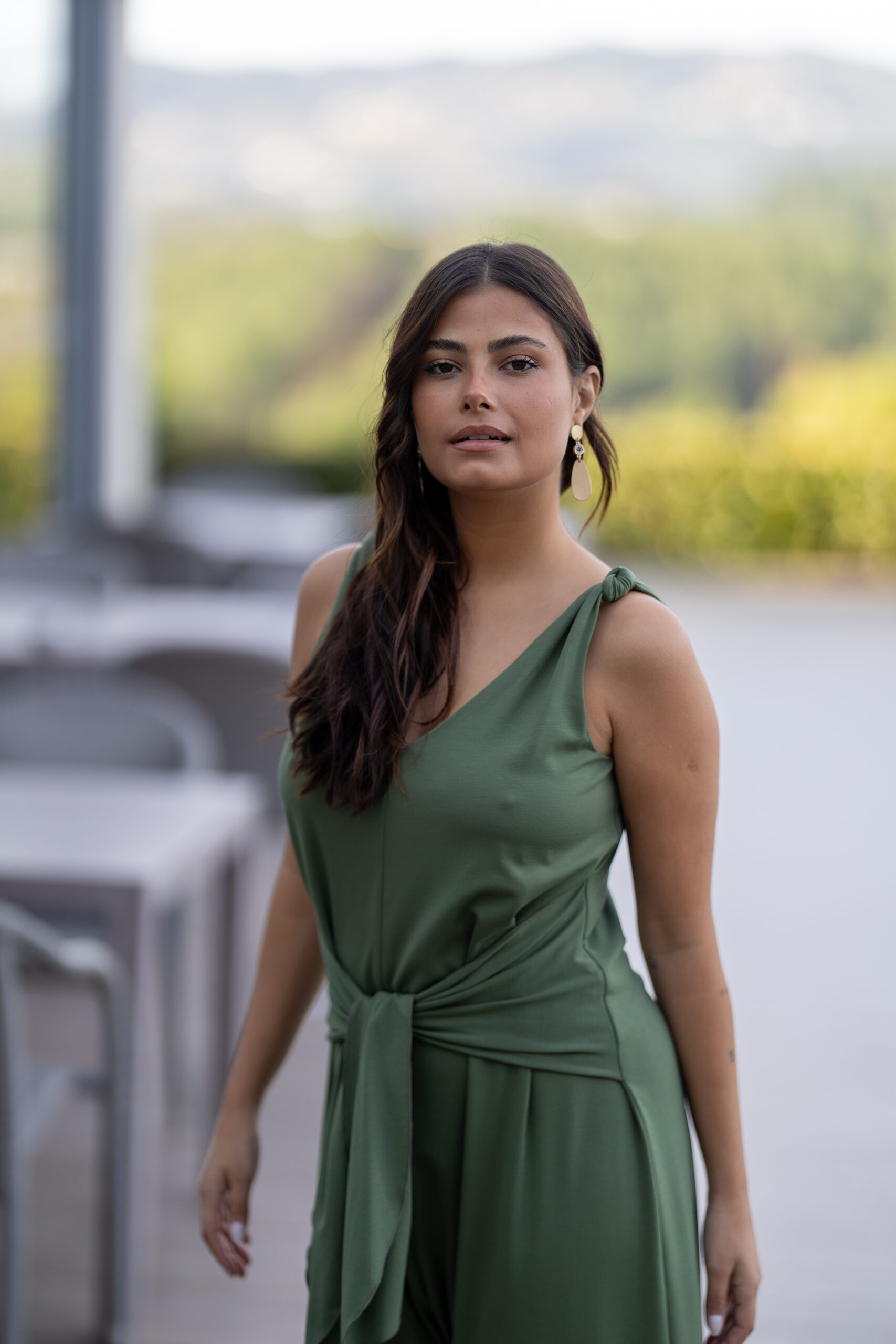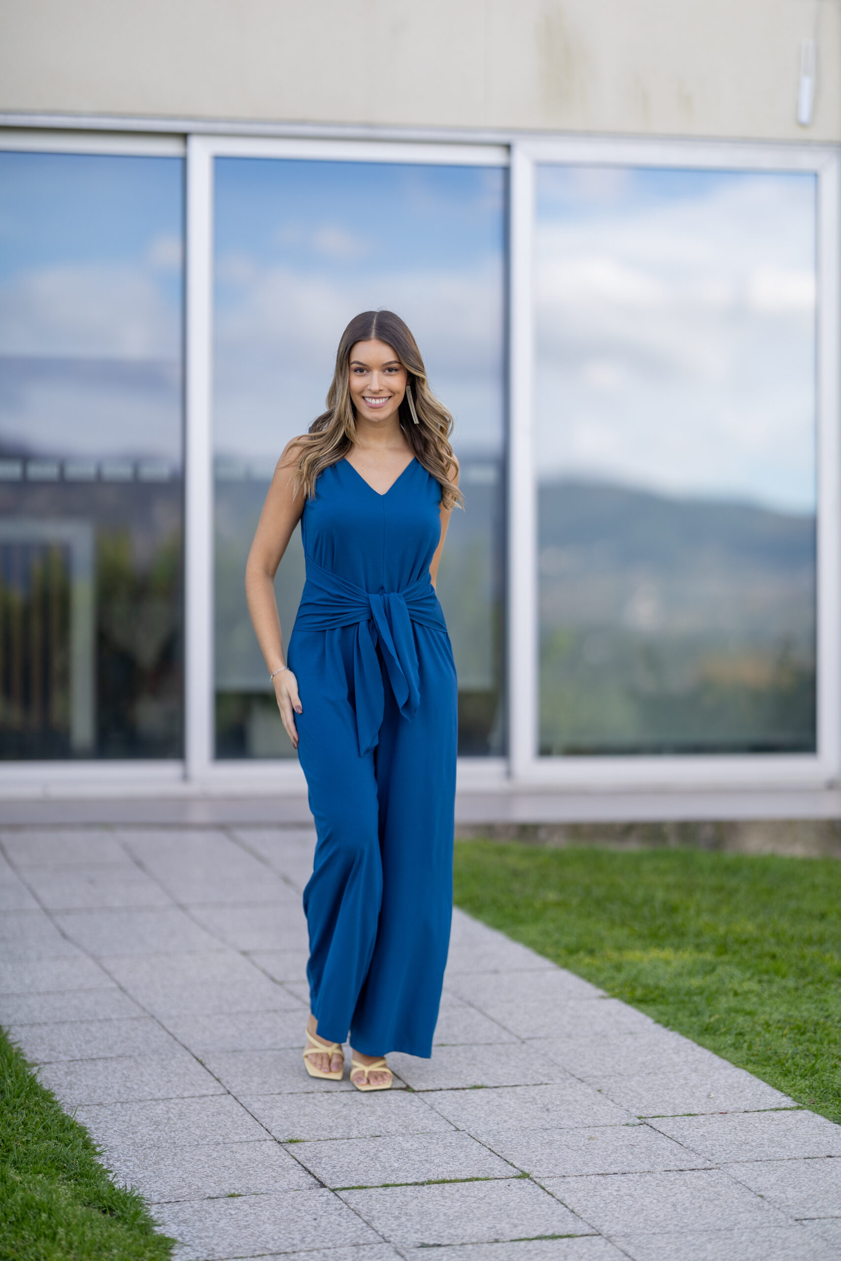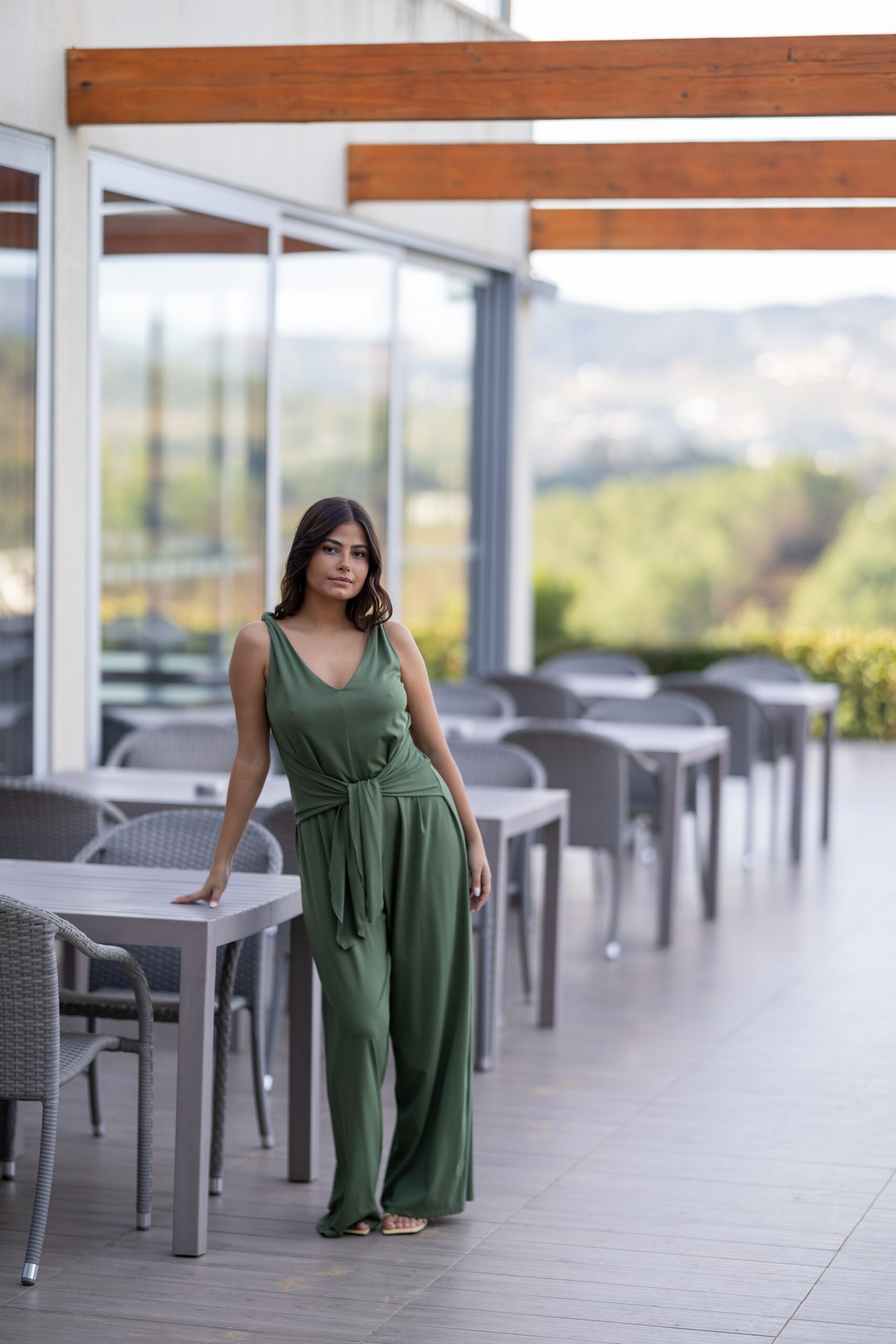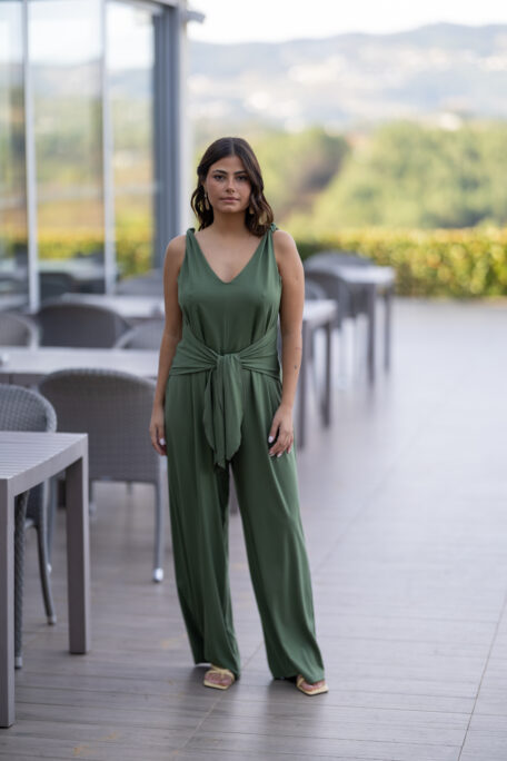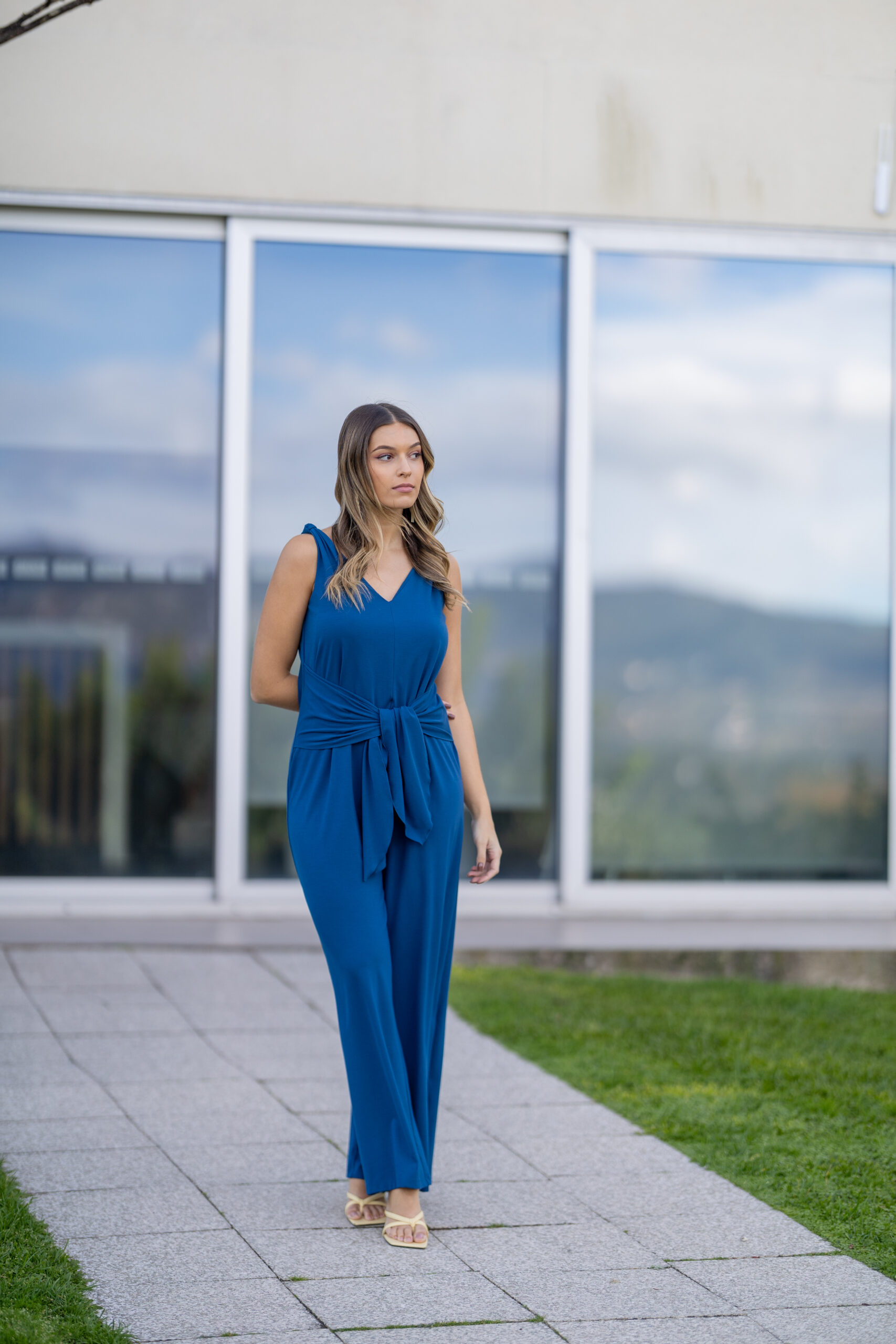 Macacão caveado com pormenor de nó nos ombros. Decote em V na frente e costas. Pormenor de tiras para atar na cinta. Bolsos laterais.